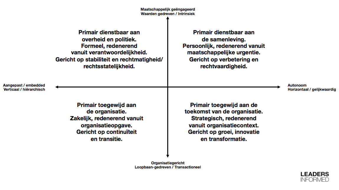 Dit opinie-artikel vormde de opmaat voor de leiderschapsconferentie 2016. Het beschrijft de paradigma-verschuivingen in het denken over de overheid en ambtenarij en de daarbij veranderende rol van topambtelijk bestuur. Het beschrijft de verschillende 'ethische sferen' waartussen topambtelijk bestuurders opereren en de wijze waarop zij hun professionele ruimte moreel verantwoord invulling kunnen geven.